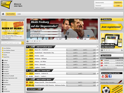 Auch mobile Wetten sind auf Interwetten.com möglich. Seit 2004 können Sie bei Interwetten mit Ihrem Mobiltelefon Sportwetten abgeben. Außerdem gibt es bei Interwetten seit 2010 auch eine spezielle Anwendung für i-Phone-Benutzer.